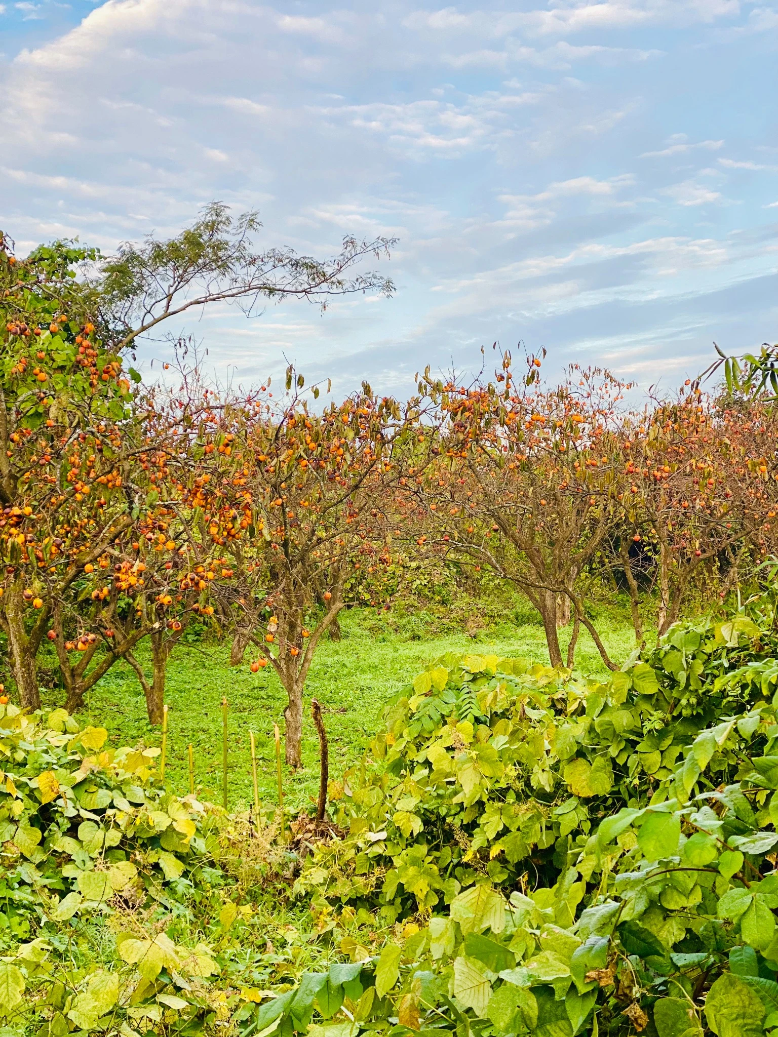 柿畑の向こうに冬の始まりの空。静かな、いい朝