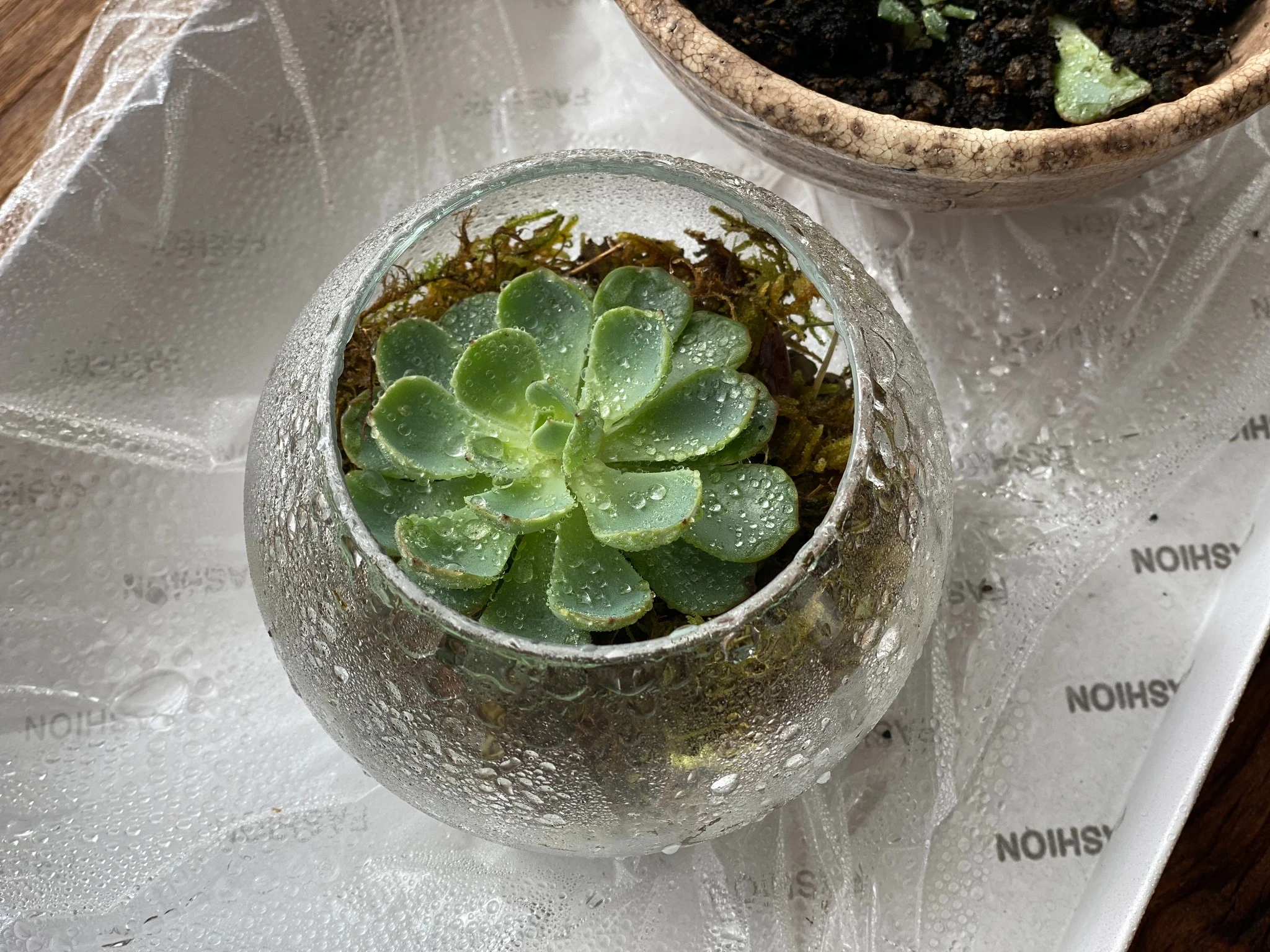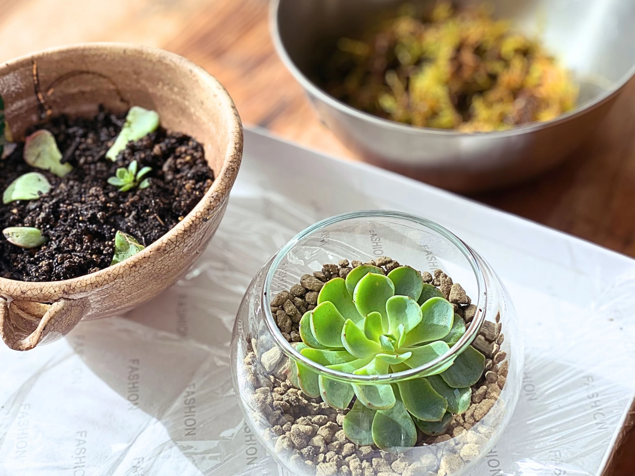 今回は朝のうちに多肉植物「七福神」を使って小さなアレンジをしたいと思っています。