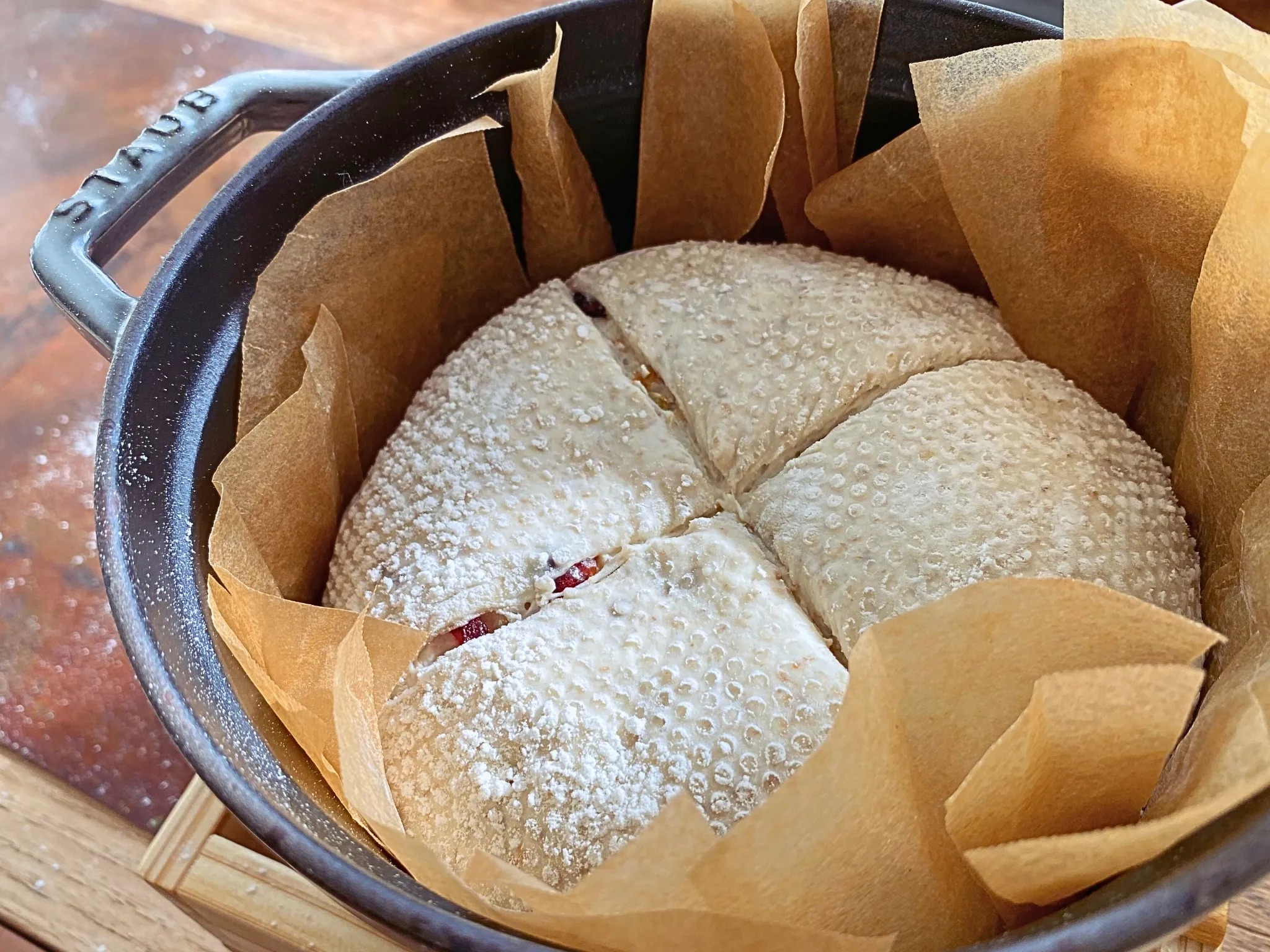 切れ目(クープ)を入れて、オーブンシートのままストウブに入れ、蓋をしてオーブンへ。