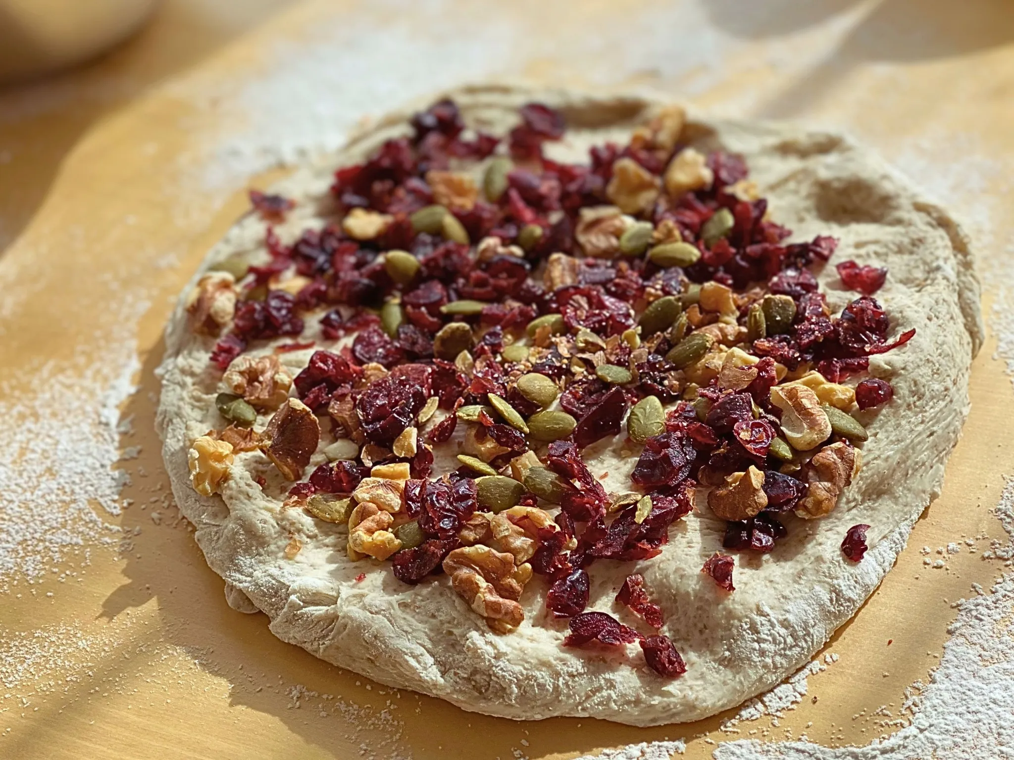 5. 生地を広げてドライフルーツやナッツを巻き込む